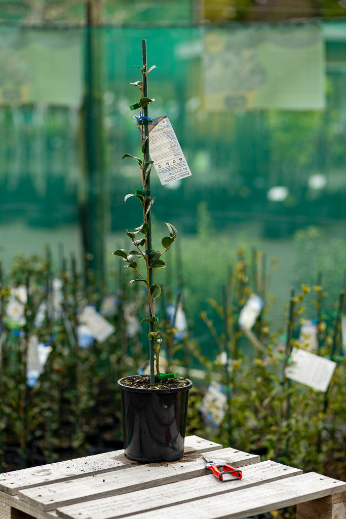 This charming new Slimline sasanqua hybrid Camellia stands tall and slim, blooming beautifully throughout Autumn. Its double-white flowers are not only eye-catching, but also carry a gentle scent. The lush, deep green leaves add rich colour, making it perfect for creating a striking hedge, elegant topiary, or adding whimsical touches to any classic garden.