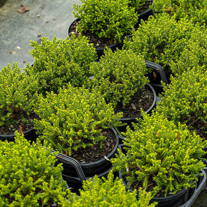 Hebe Emerald Green is a vibrant shrub with upward-growing branches creating a neat, cushiony shape. It sports small white flowers in summer and works well in compact gardens or to add a tidy, formal touch to any planting scheme.