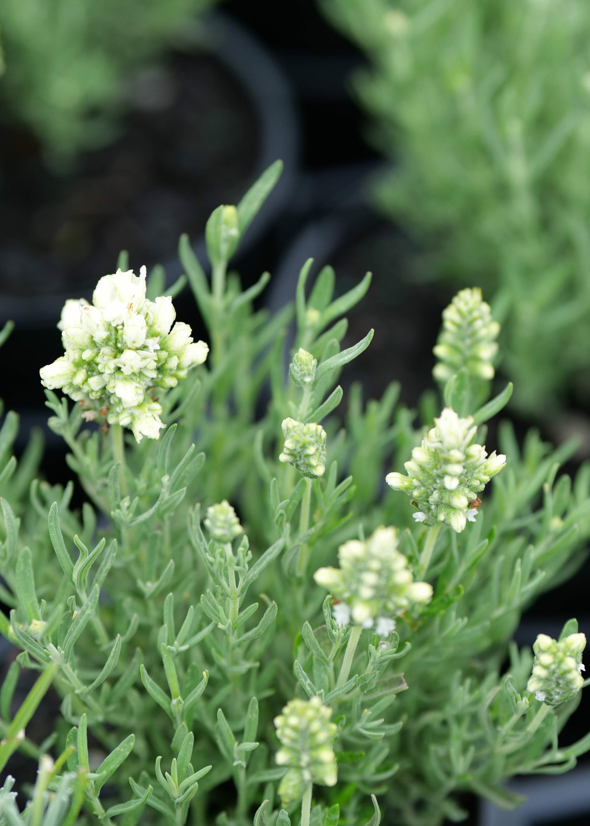 A pure white lavender with ruffled flowers continuing down the flower head. Something a bit different from the normal lavender. Plant in full sun with free draining soil for the best flowering. Trim and dead head to keep it bushy and to avoid woodiness.