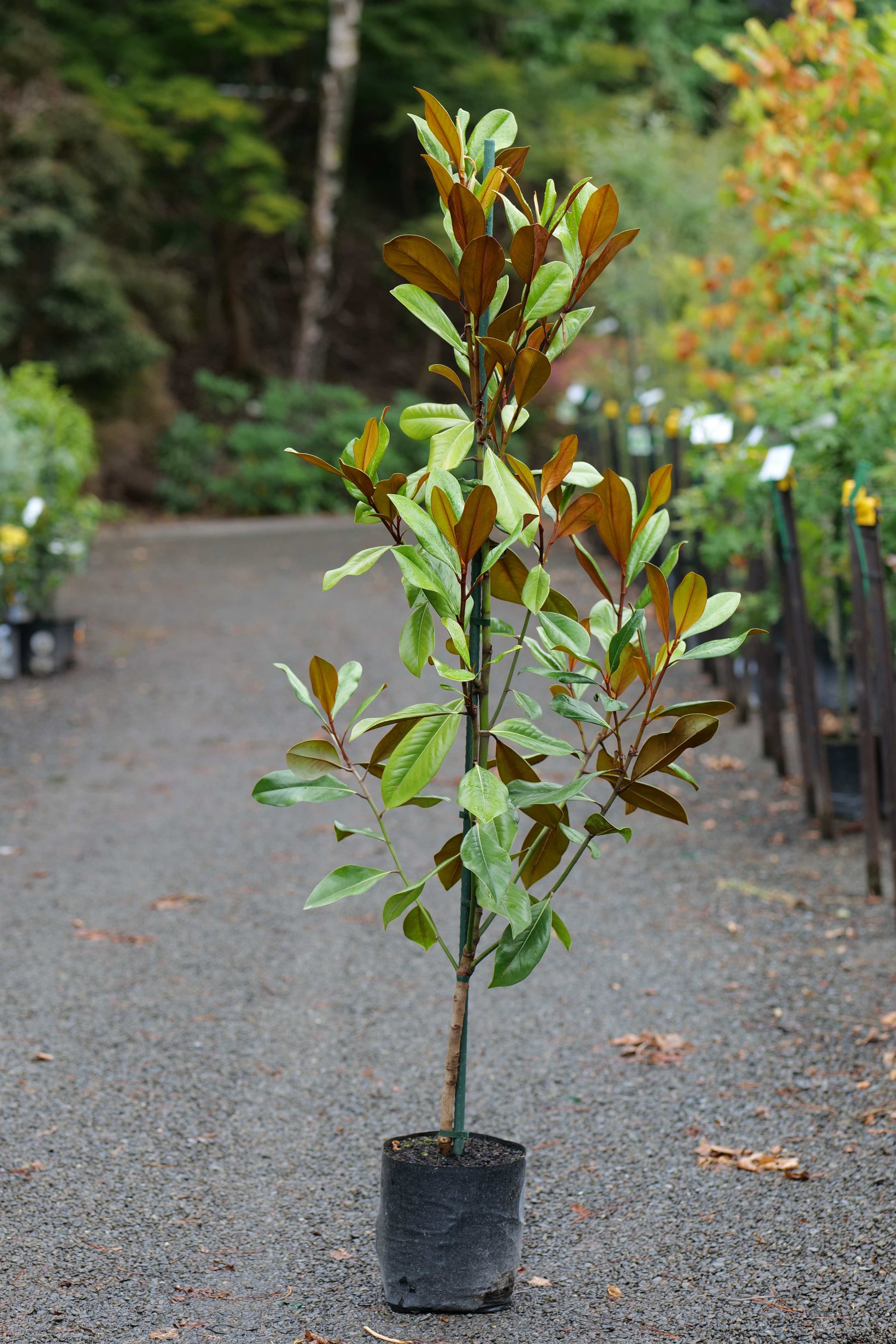 A truly eye-catching evergreen with deep green, shiny leaves and a unique coppery fuzz underneath. It grows in a neat, pyramid shape and bursts into large, creamy-white, fragrant flowers during Summer. Perfect for lining a path or standing solo to steal the show.